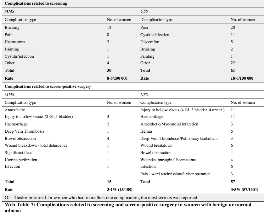5. Of the screening groups 1634 women [50 per 10,000 screens] had unnecessary surgery i.e. surgery that yielded benign results.  The rate of “false positive” surgery was described by the ratio of benign : malignant pathology.  The ratios by group were : No-screening = 1 : 1.2,  MMS 2.7  and USS 1: 6.4 .   The surgical complication rate is quoted as 3.5%.  Unfortunately the actual harms of the surgeries were not documented as far as I can tell from the paper.  They are discussed in the 2-hour video produced at the trial launch – but bizarrely not in the actual paper. So it is hard to say what the actual true “harms of screening” are in this study.  Below is the table you can find in the supplementary material which describes the types and numbers of harm events in the screening groups.  For the record – in the PLCO trial the surgical complication rate in screened women was ~15% – so 5 times higher than the UK group…  must be better surgeons in the NHS?Screen Shot 2015-12-28 at 9.53.46 PM