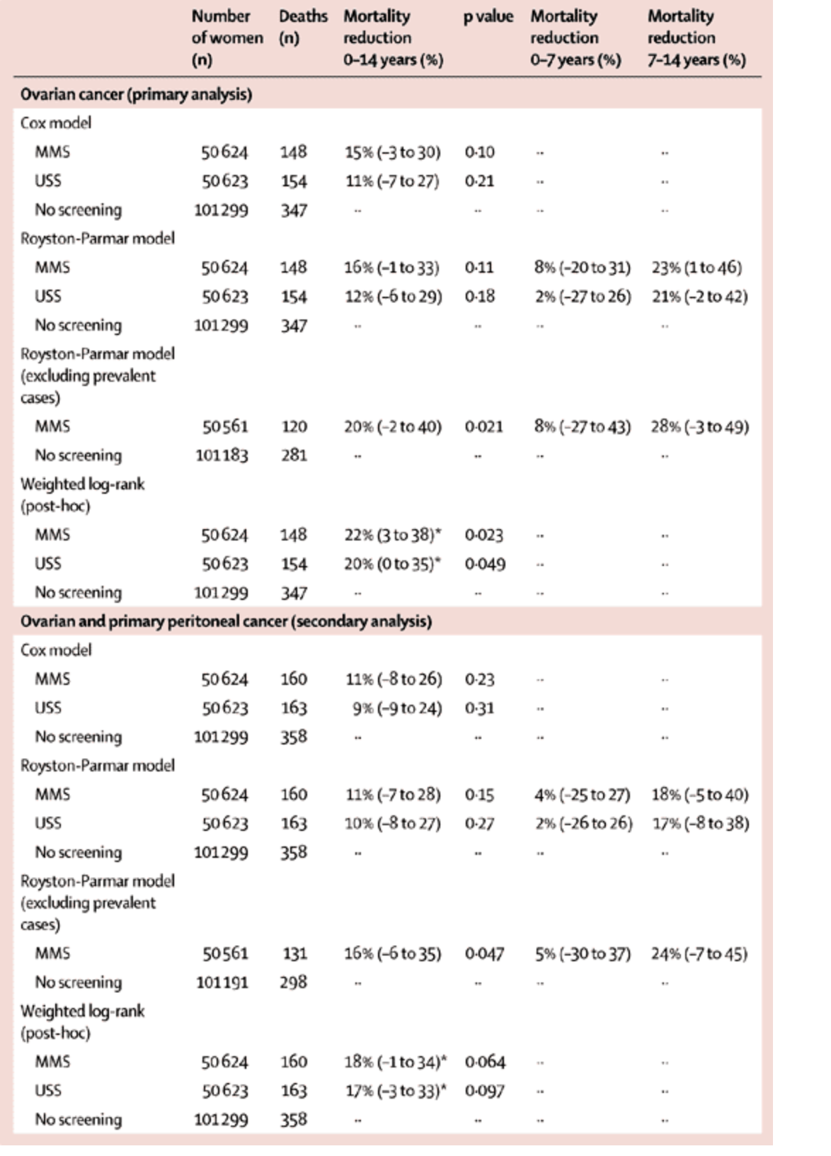 Note – this is a disease-specific mortality outcome.  There was no mention of “all cause mortality”.  The trial was powered to detect a 30% mortality benefit for screening.  There is no data provided in the paper about “all-cause mortality”.  This is a bit odd as the best measure of the effect of a screening intervention would be “all-cause mortality”.  The use of disease-specific mortality is useful to tell us if the screening actually does pick up cancers earlier and prevent death from ovarian malignancy, however….  we, and our patients, want to know if it will make them live longer.  Only all-cause data can tell us this.  If screening means that we diagnose ovarian cancer early and then we increase other mortality eg. more PEs or surgical deaths then we are not doing the right thing by our patients.