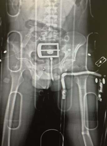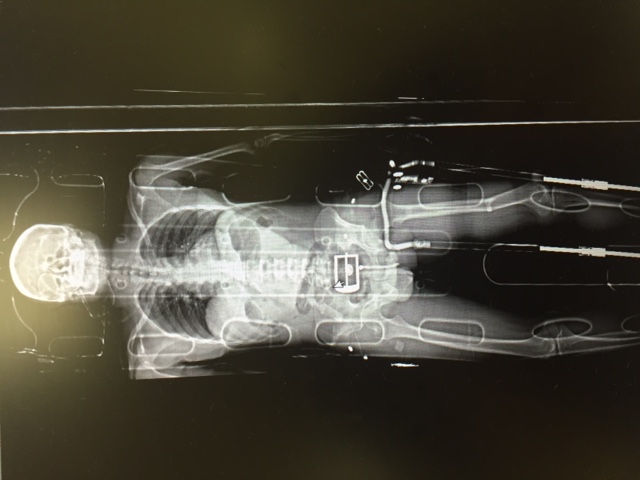 A 33 year old pedestrian was brought to the ED by EMS. He has been hit by a car. The paramedics report that he is haemodynamically stable and alert with a suspected left femur fracture. A trac-3 splint is in place. A lodox scan is done in resus while he is still on the spine board and this is what it shows: