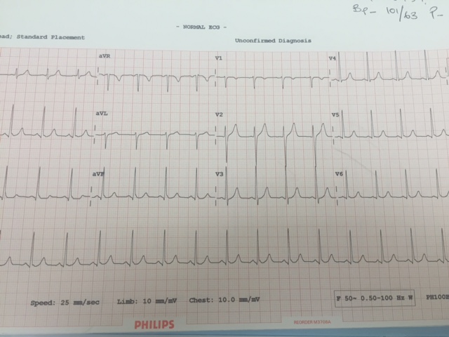 Regardless of the cause or precipitant of the SVT, it requires treatment. Valsalva manoeuvres are attempted in the form of blowing a syringe and carotid sinus massage, but aren’t successful. Adenosine 6mg is given, which is followed by the seemingly eternal sinus pause. A sinus rhythm at 80 BPM commences thereafter and he remains in sinus. A 12 lead ECG done: