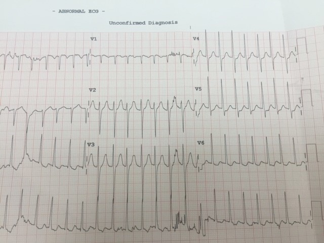 Another form of shock could be present. Obstructive forms of shock such as tension pneumothorax and cardiac tamponade have already been ruled out. Neurogenic is unlikely as he has no disability / evidence of thoracolumbar or neck trauma. This degree of tachycardia is pretty unusual for an adult. It also has not changed at all despite fluid resuscitation. One can’t make out the p waves on the monitor, either. A 12-lead ECG is done: