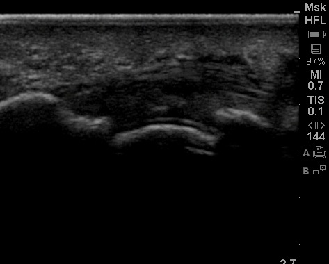 Really I am just having a gander to check where I could place a needle into a pocket of synovial fluid safely. This is an image I caught…. It contains a sign which is supposedly very specific for one of the above diagnoses. Maybe we can spare the needle?