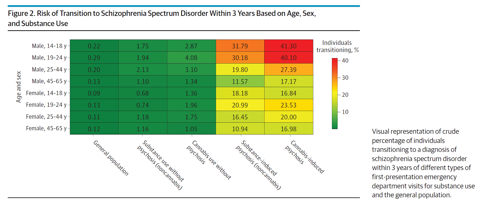 Myran DT, Harrison LD, Pugliese M, Solmi M, Anderson KK, Fiedorowicz JG, Perlman CM, Webber C, Finkelstein Y, Tanuseputro P. Transition to Schizophrenia Spectrum Disorder Following Emergency Department Visits Due to Substance Use With and Without Psychosis. JAMA Psychiatry. 2023 Sep 27:e233582. doi: 10.1001/jamapsychiatry.2023.3582. Epub ahead of print. PMID: 37755727